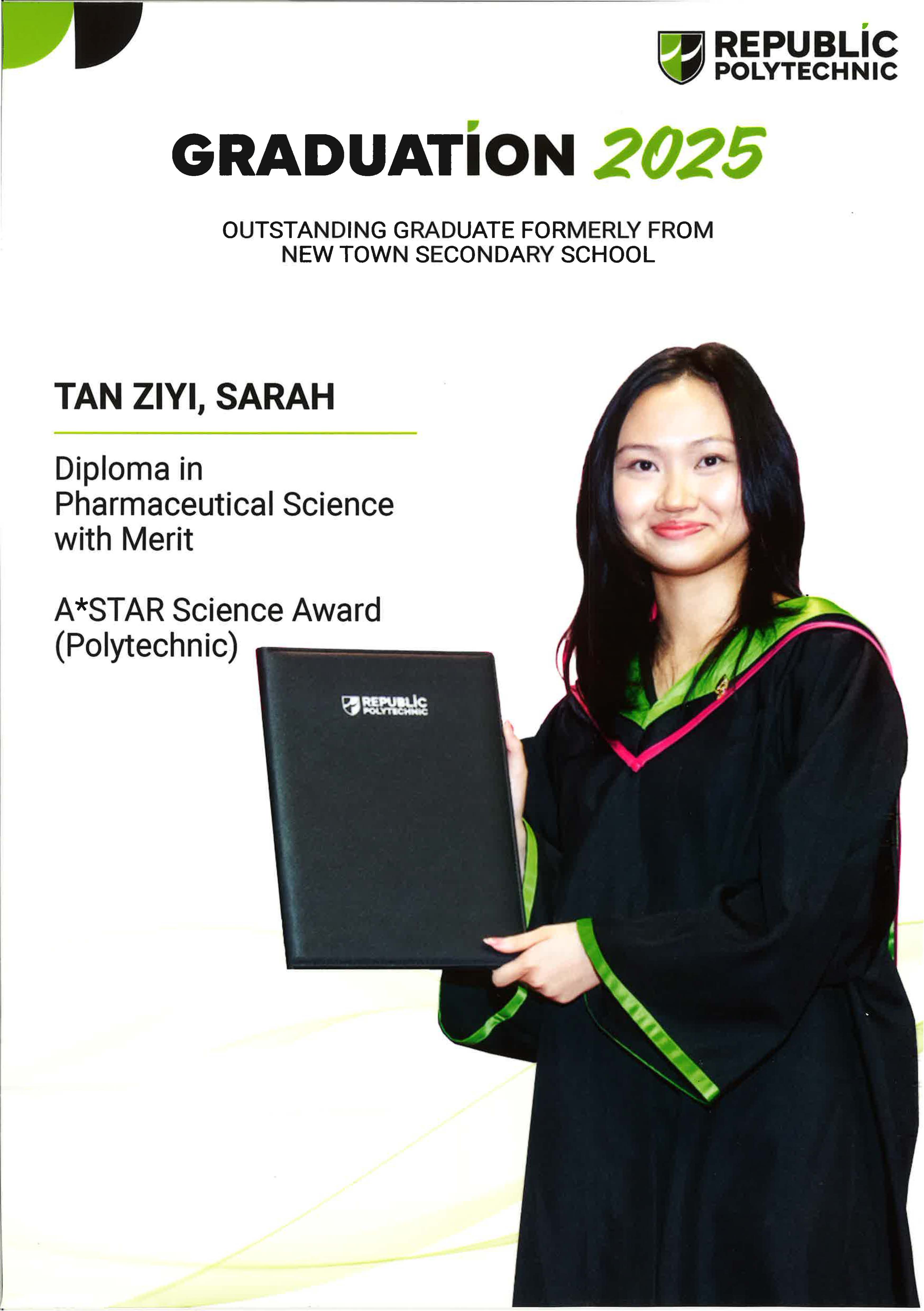 Tan Ziyi, Sarah An alumnus of New Town Secondary School, attained a Diploma in Pharmaceutical Science with Merit and was awarded the A*STAR Science Award (Polytechnic) at the Republic Polytechnic Graduation Ceremony 2025. |