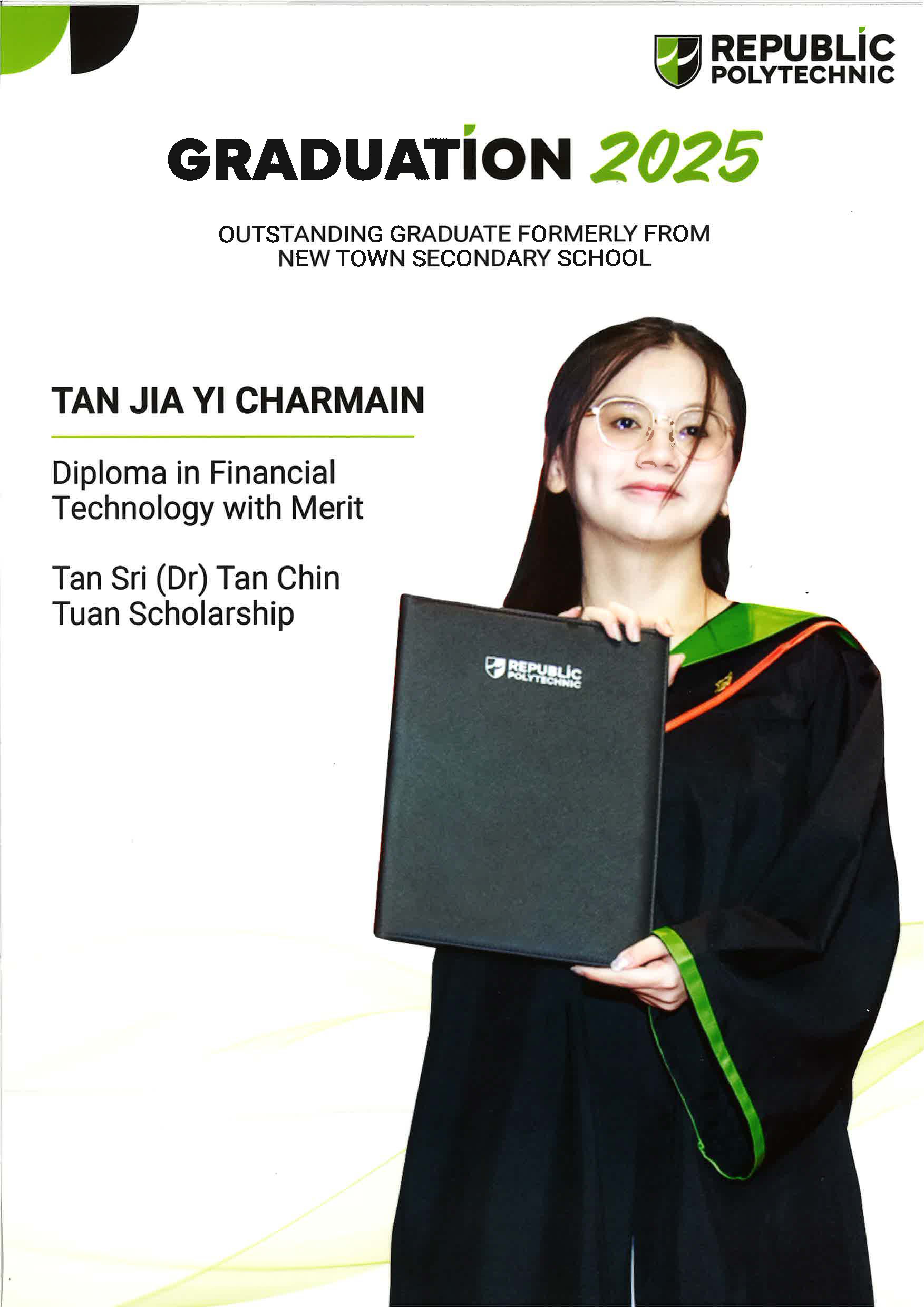 Tan Jia Yi Charmain An alumnus of New Town Secondary School, attained a Diploma in Financial Technology with Merit and was awarded the Tan Sri (Dr) Tan Chin Tuan Scholarship at the Republic Polytechnic Graduation Ceremony 2025. |
