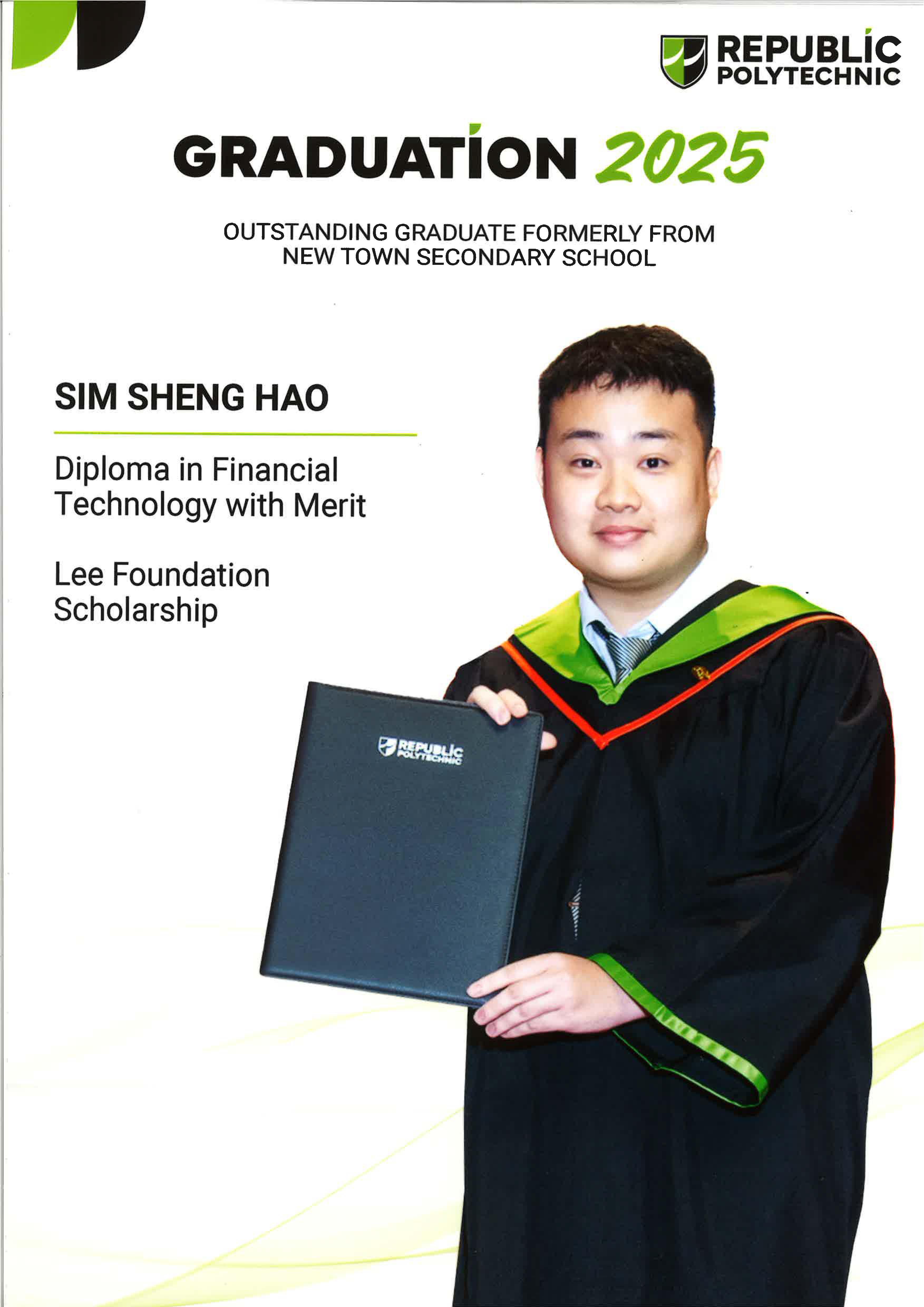 Sim Sheng Hao An alumnus of New Town Secondary School, attained a Diploma in Financial Technology with Merit and was awarded the Lee Foundation Scholarship at the Republic Polytechnic Graduation Ceremony 2025. |