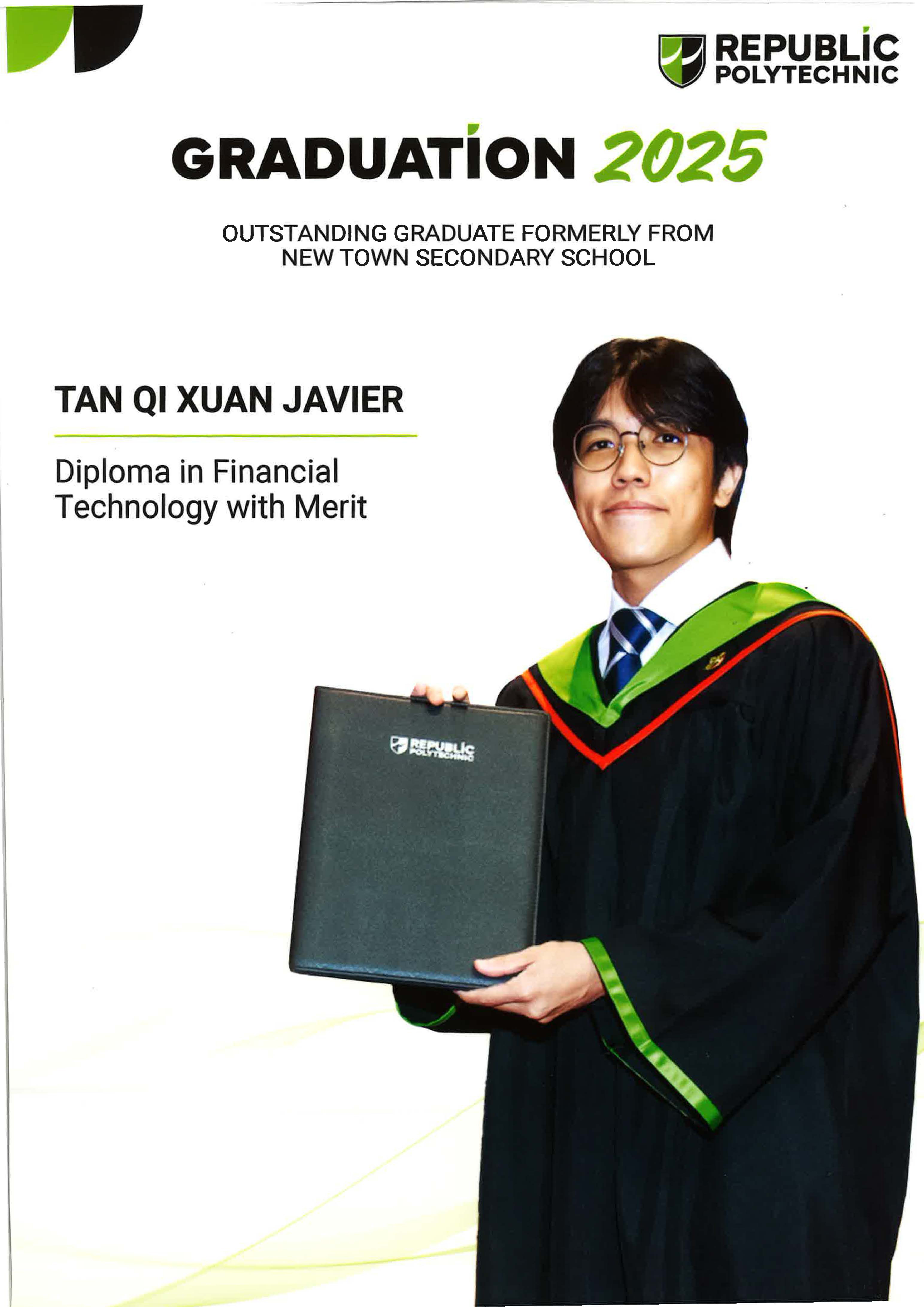 Tan Qi Xuan Javier An alumnus of New Town Secondary School, attained a Diploma in Financial Technology with Merit at the Republic Polytechnic Graduation Ceremony 2025. |