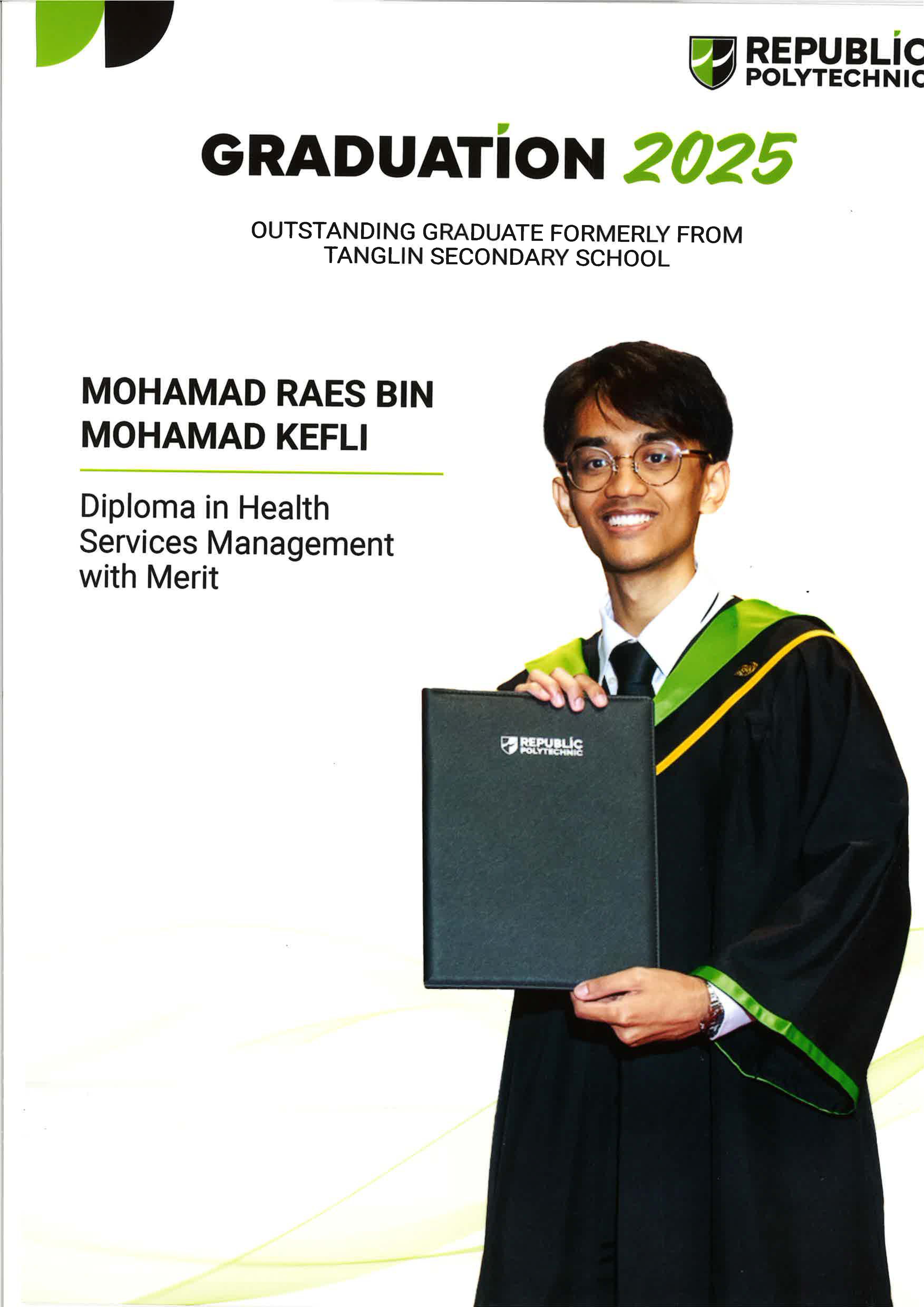 Mohamad Raes Bin Mohamad Kefli An alumnus of Tanglin Secondary School, attained a Diploma in health Services Management with Merit at the Republic Polytechnic Graduation Ceremony 2025. |